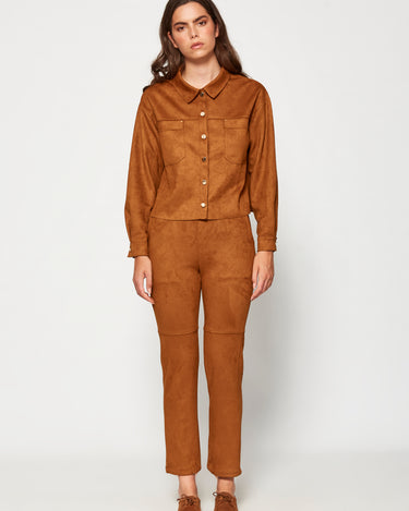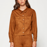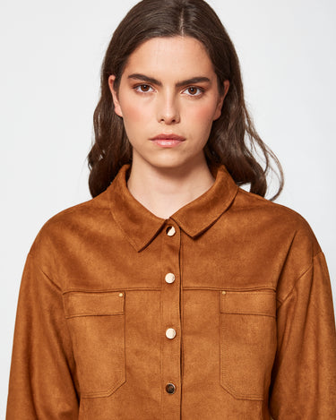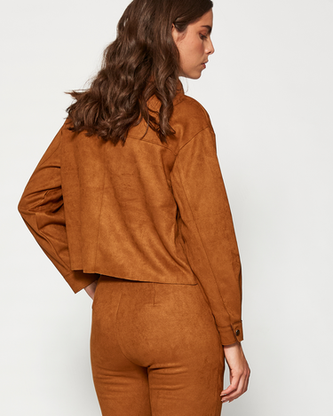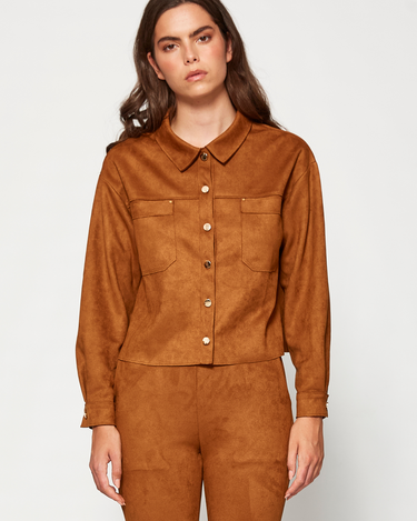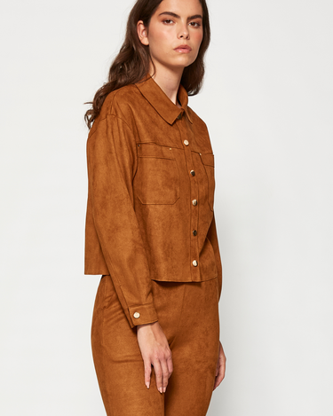 This dark khaki shirt, crafted in a soft suede-like fabric, is perfect for fall and winter layering. Featuring button-down styling and functional chest pockets, its slightly cropped fit adds a modern touch while keeping you comfortably warm. Ideal for adding a refined, seasonal layer to your wardrobe.
