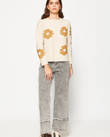 This elegant wool-blended sweater features long sleeves and a cozy fit, perfect for layering during the crisp fall and winter months. Adorned with delicate floral embroidery on the front, it adds a subtle touch of charm to your seasonal wardrobe while providing warmth and comfort.