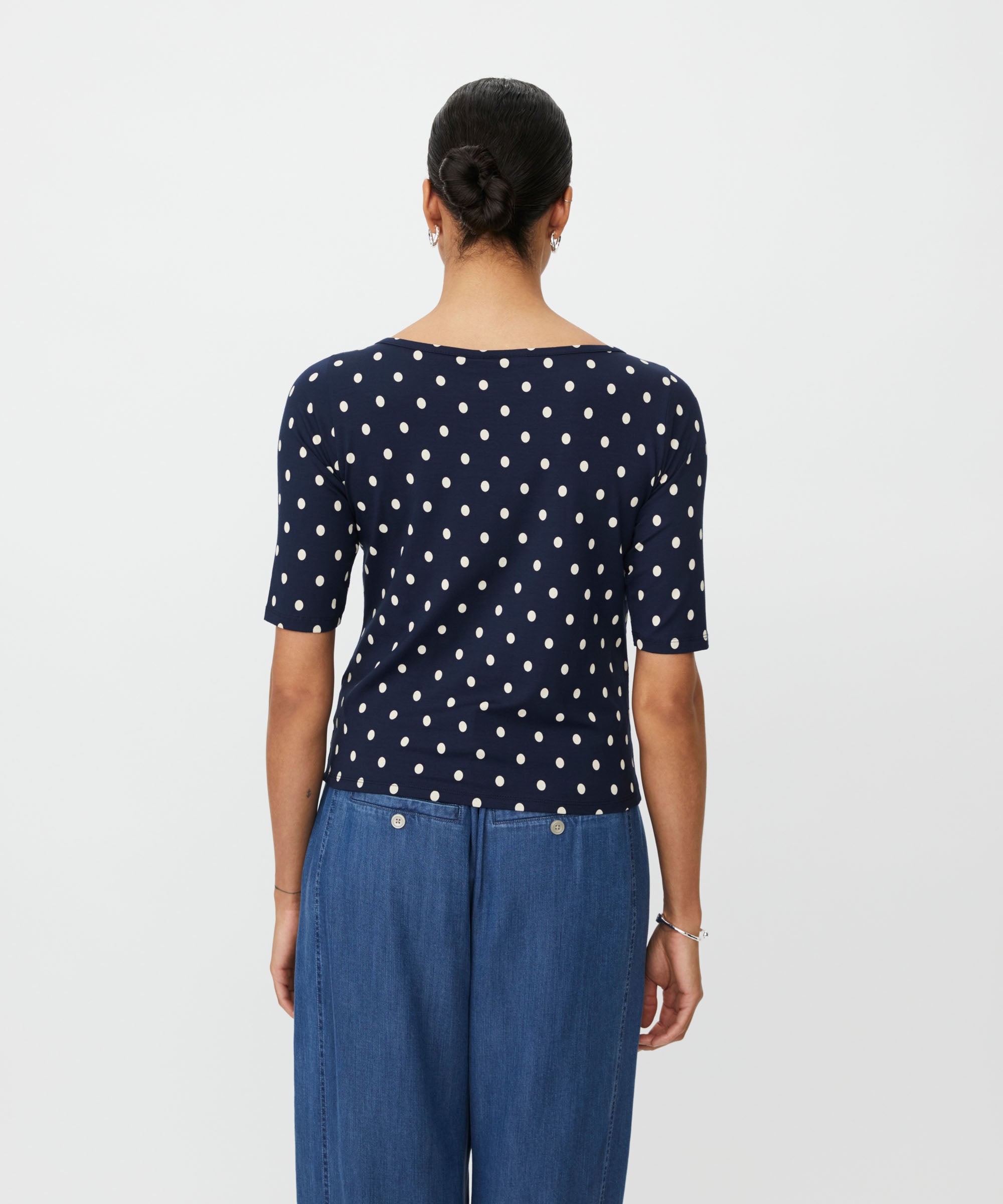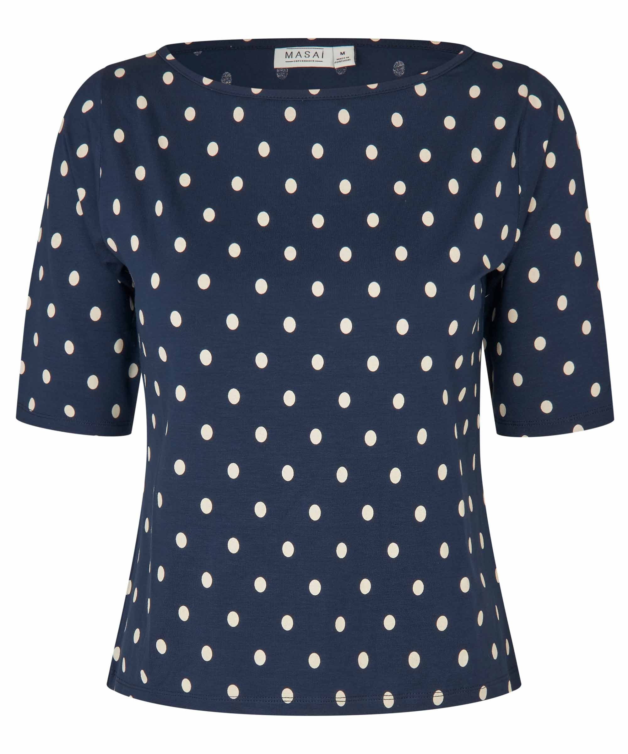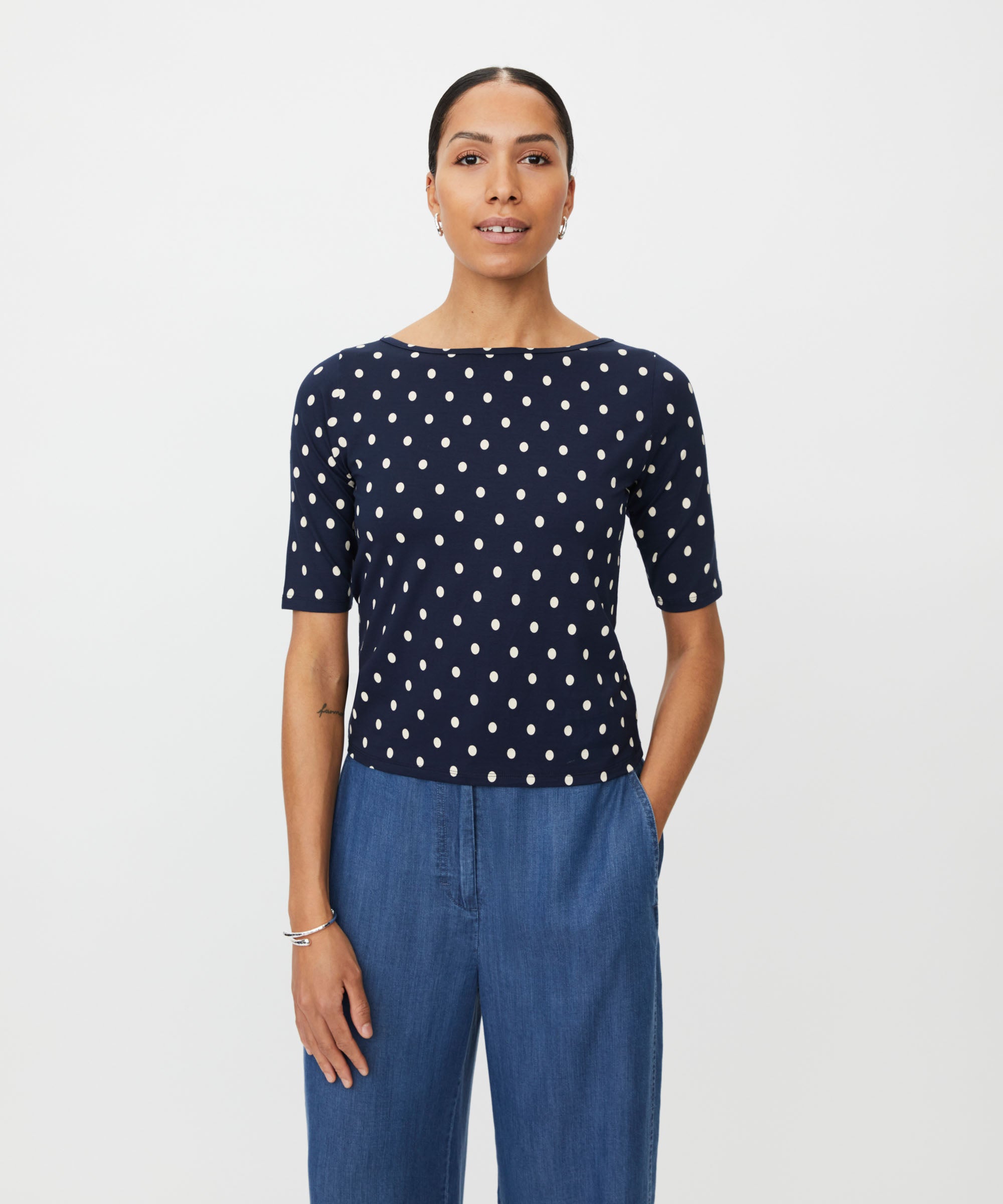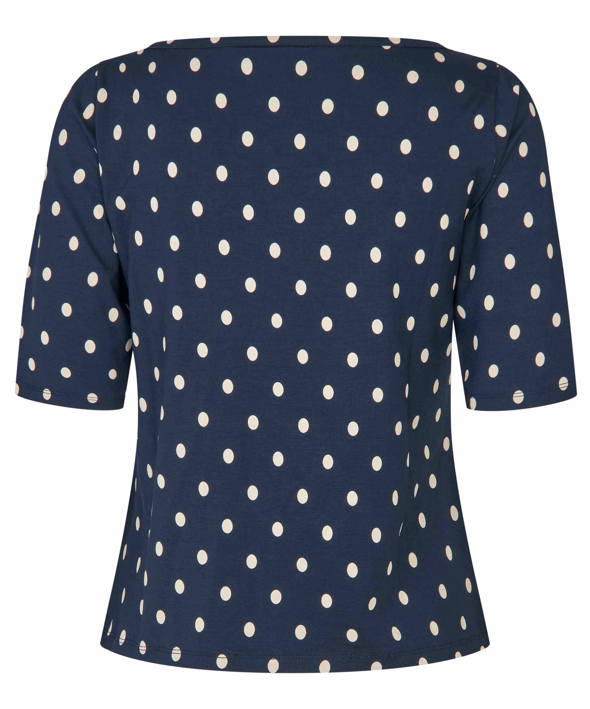 Embrace effortless spring style with this charming viscose blend top featuring a playful polka dot print. The half-sleeve design and boat neck neckline offer a flattering, versatile silhouette perfect for layering. Crafted from a soft viscose-elastane blend, this cute and fun piece transitions seamlessly from casual days to weekend outings. An essential addition to your seasonal wardrobe.