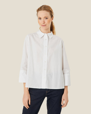 This 100% cotton MaIlonka Shirt in white features a refined button-down design with elegant 3/4 sleeves and accentuated cuff details. Perfect for fall and winter, it elevates a classic wardrobe staple with thoughtful tailoring, making it a versatile layering piece that combines comfort with timeless sophistication.