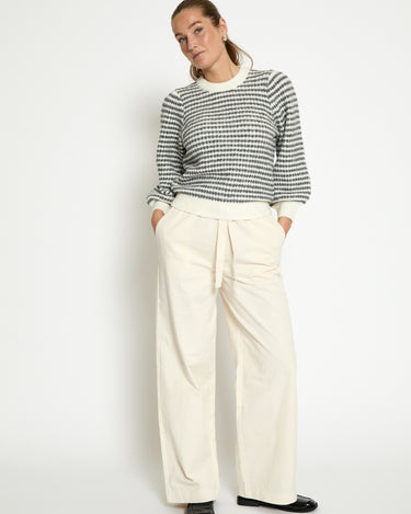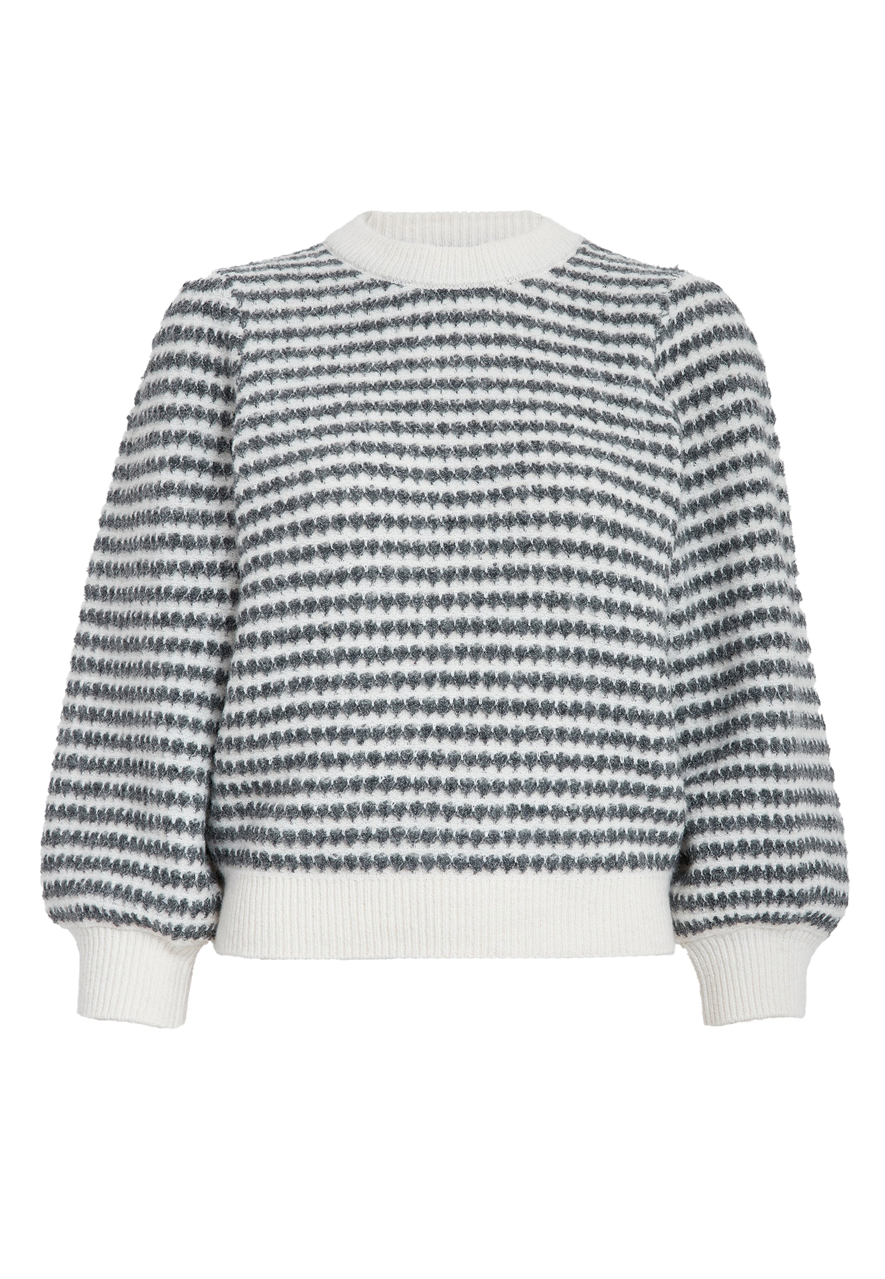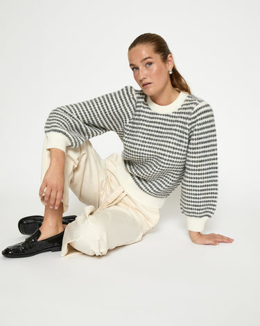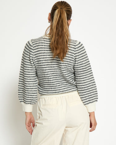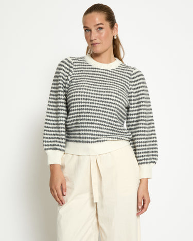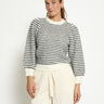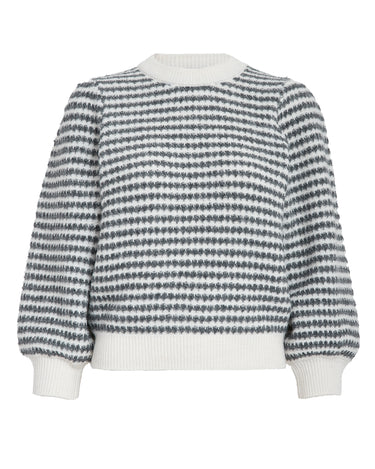 Elevate your fall and winter wardrobe with the PC7990 Camilla 3/4 Sleeve Striped Knit Pullover in Whitecap Stripe. Crafted from a cozy wool blend, this warm sweater features a refined striped pattern and elegant puff sleeves. Its long sleeves and comfortable knit make it perfect for layering, offering both style and comfort during cooler seasons.