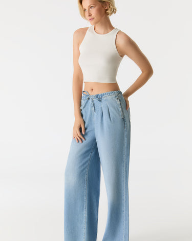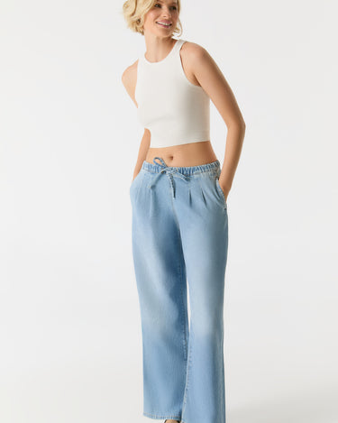 These trousers are perfect for days when comfort is the priority. The light wash and soft denim provides a feminine style, and the trousers are designed with an elasticated waist with a drawsting,  slit pockets, and wide legs, making them as comfortable as jogging bottoms. The delicate pleats at the front add an extra elegance. Style them with a feminine shirt or a basic top  for a relaxed, stylish look .