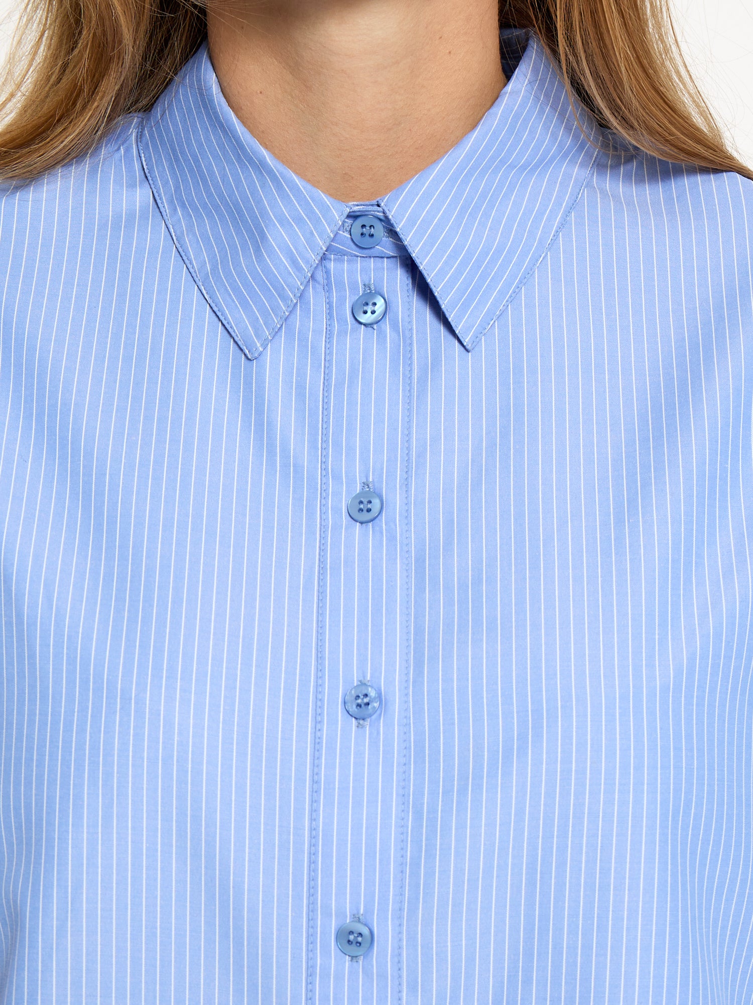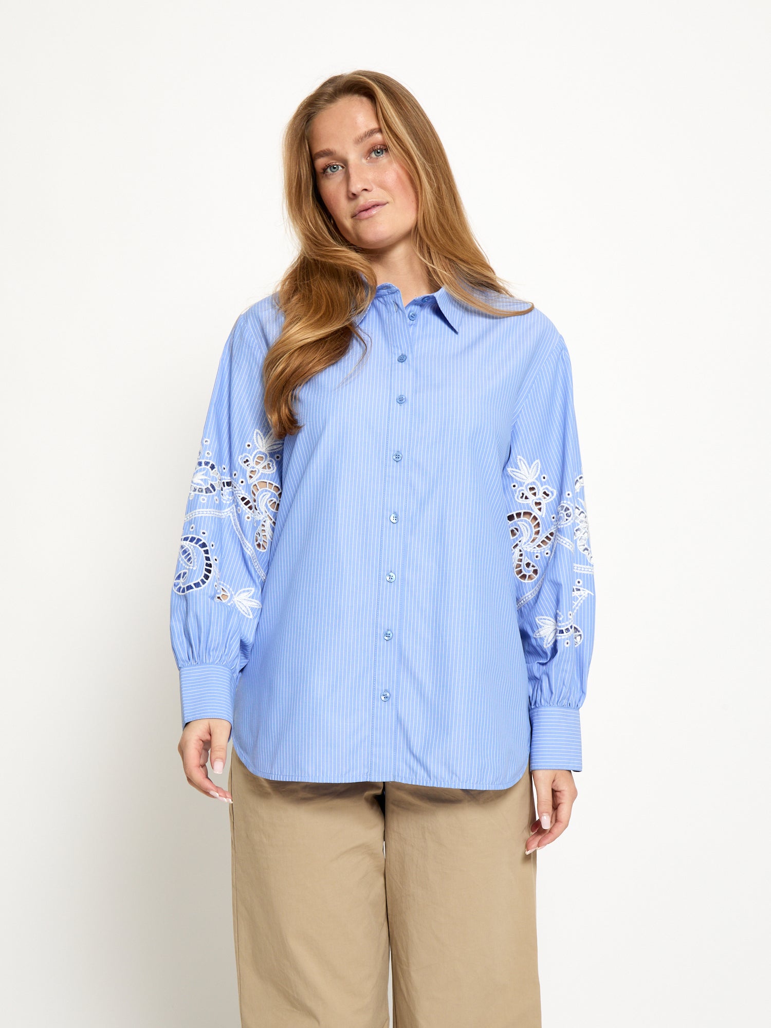La chemise Netty allie une élégance naturelle à des détails soignés. Confectionnée dans un mélange de coton respirant, cette pièce à la coupe décontractée présente de charmantes broderies aux coudes des deux manches – une touche raffinée qui sublime les superpositions décontractées. Ses rayures bleuet lui confèrent une grande polyvalence pour les garde-robes printanières, s'accordant aussi bien avec un pantalon tailleur qu'avec un jean décontracté. Idéale pour créer des looks sophistiqués et superposés, tout en subtilité.