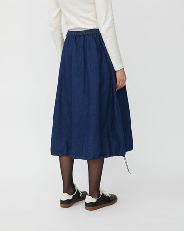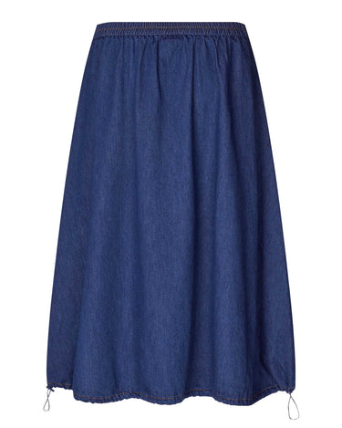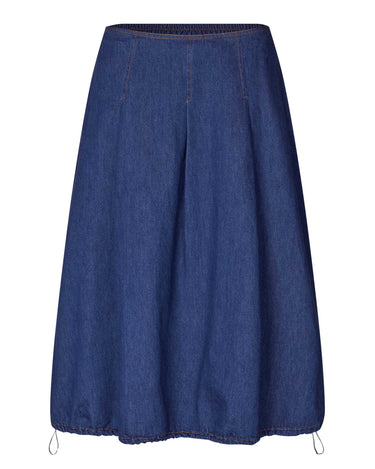 The 1011172 MaStephi Skirt in dark denim is crafted from 100% cotton, offering comfort and durability for fall and winter layering. Its mid-length design features an adjustable cinch at the bottom, allowing a tailored silhouette, while convenient pockets enhance its practicality. This skirt combines timeless elegance with versatile functionality for a polished seasonal look.
