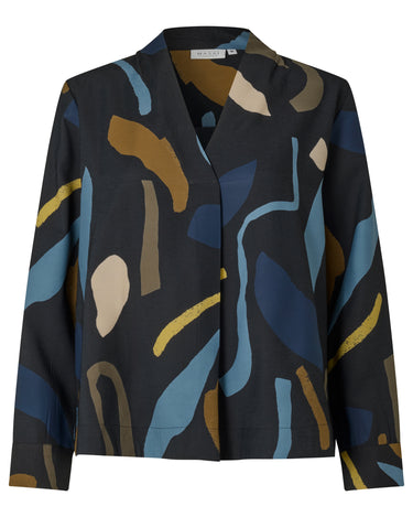 Embrace the cooler seasons with the 1011261 MaDelvion Top in Proven Blue, featuring an elegant earth tone pattern perfect for fall and winter layering. Crafted from a soft viscose blend, this long-sleeve top offers both comfort and refinement. Its elevated design includes a collar and a flattering V-neckline, making it a versatile piece that effortlessly combines warmth with sophisticated style.